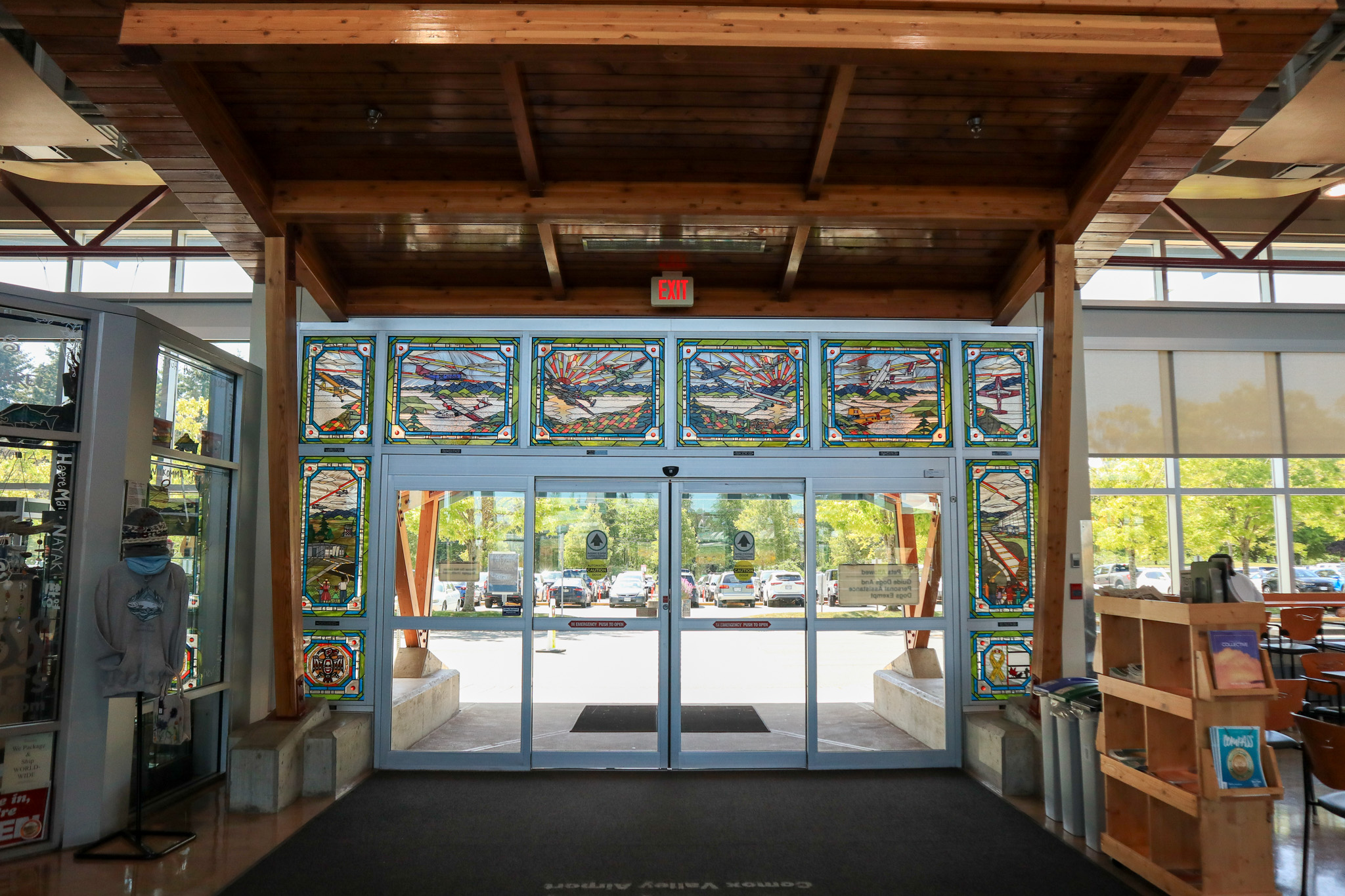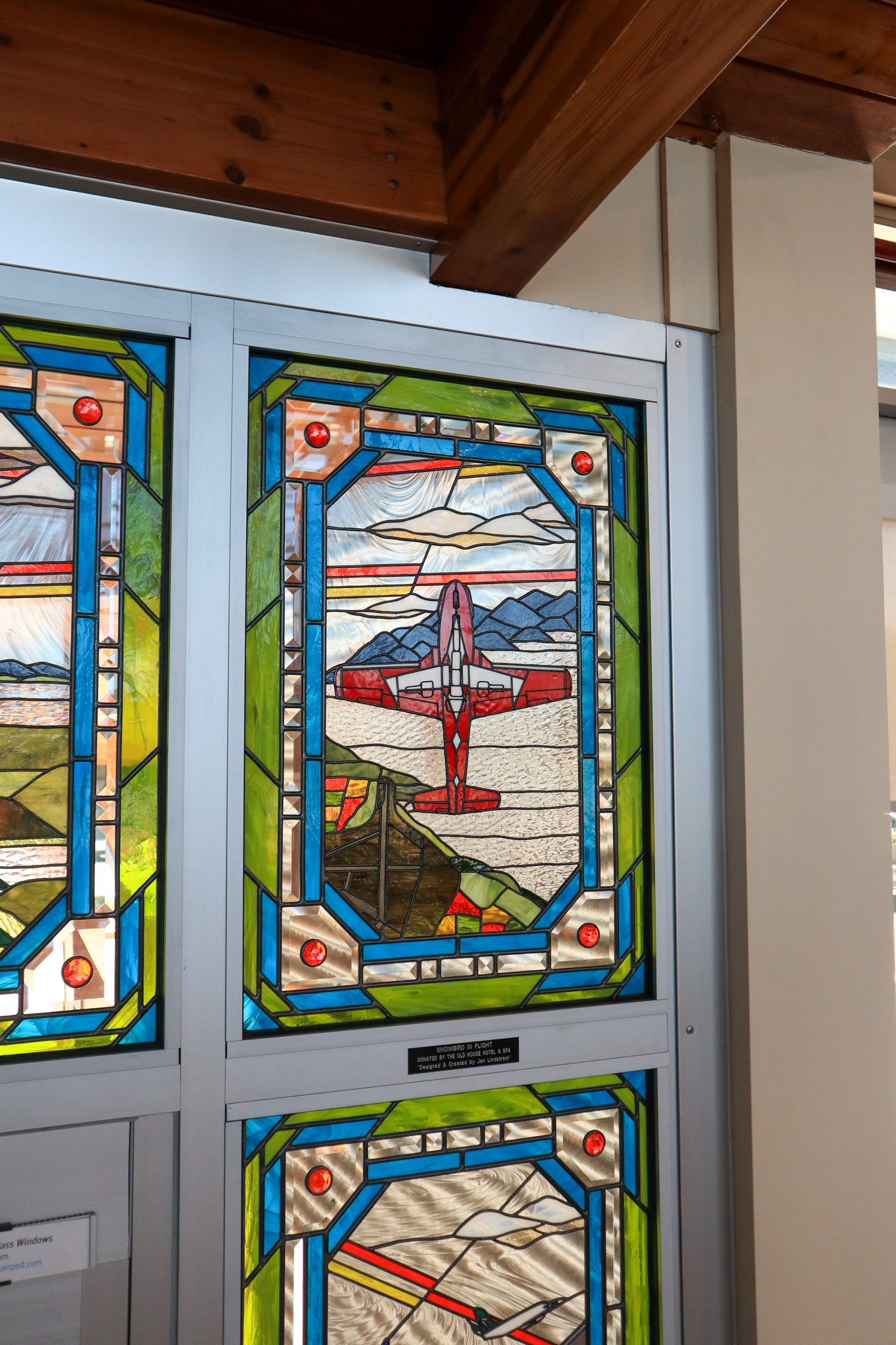 Travellers that come to the Comox Valley Airport are greeted by a stunning stained glass work of art by local reknowned artist, Jan Lindstrom. These are located at our centre entrance adjacent to gift shop & cafe, and our Arrivals doors.Quoted text below is from the artist Jan Lindstrom.