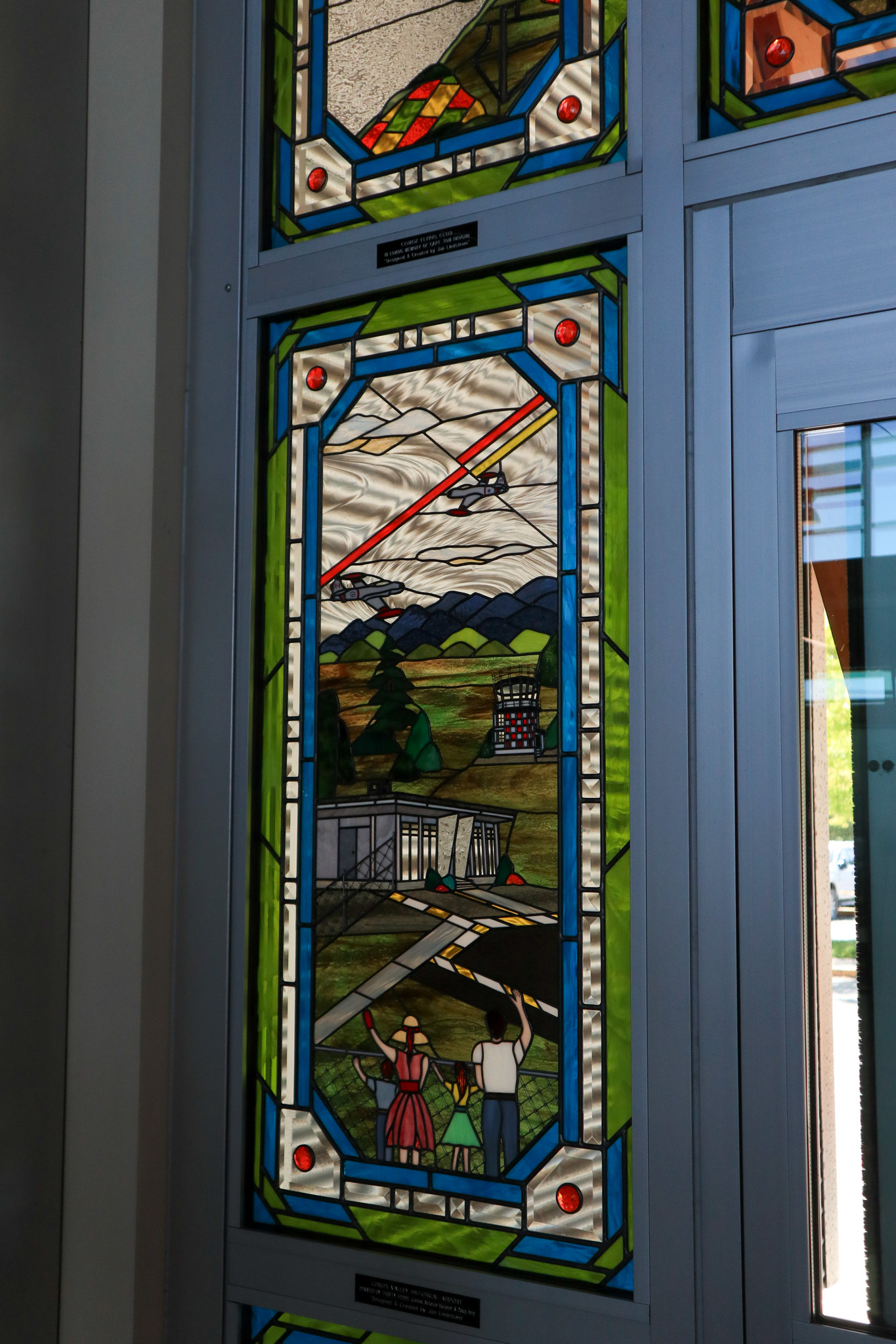 The side window on the right illustrates the new modern municipal airport and passenger terminal built in 2004 to accommodate the tremendous growth of passengers. The 40-foot curtain window in the pre-boarding area, as featured in the stained glass, is the building's main feature, and contributes to the overall cosmopolitan feeling and spaciousness. Definitely more enjoyable and inviting to visitors! The airplanes featured are the Pacific Coastal Short 360 and the WestJet Boeing 737. The new air traffic control tower was also opened in 2004. The family is again waving hello or goodbye, but are now wearing more modern clothing. This window was sponsored by the Comox Valley Airport Commission.